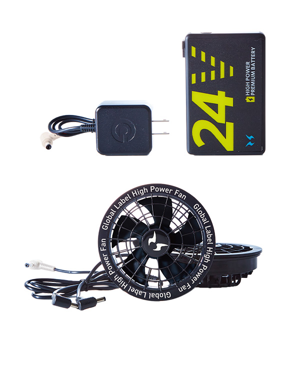 空調風神服初の海外製バッテリー、最大出力24V 最大風量100ℓ/秒のハイスペックの組合せ。