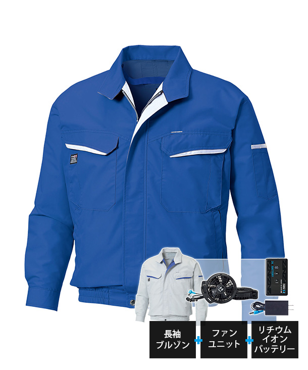 安心・安全の空調風神サンエスの人気定番商品、KF90470-K24 型崩れしにくく、涼しい空気を逃さない 長袖ブルゾン ファン・バッテリーセットです。