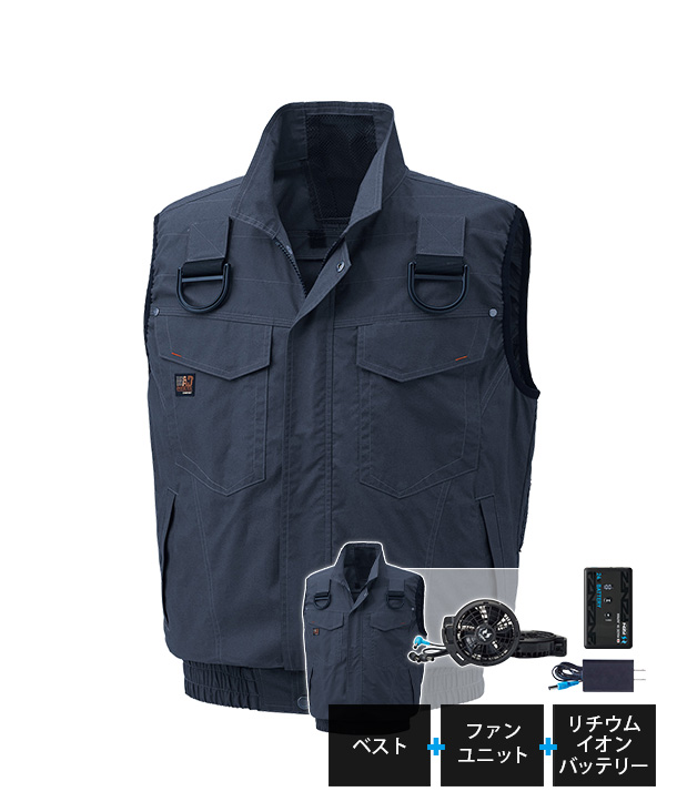 安心・安全の空調風神サンエスの人気商品、KF91490G-K24 綿100% フルハーネス対応 ベスト ファン・バッテリーセットです。
