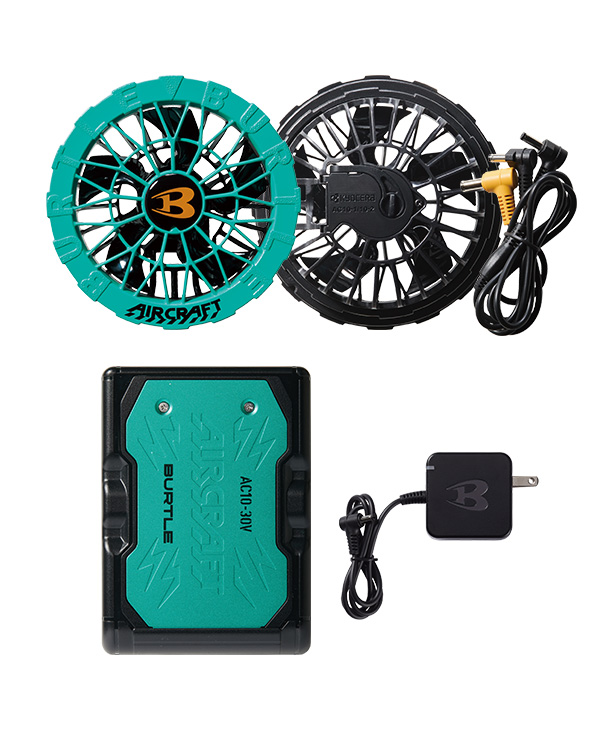 深みのあるブルーグリーンで統一されたマーリンファンとマーリンバッテリーは、落ち着きのある大人の雰囲気を演出します。カラーを揃えることでシンプルながらも上品さを感じさせ、現場でも自然に映える配色です。個性は控えめでも、統一感で確かな存在感を発揮する組み合わせです。