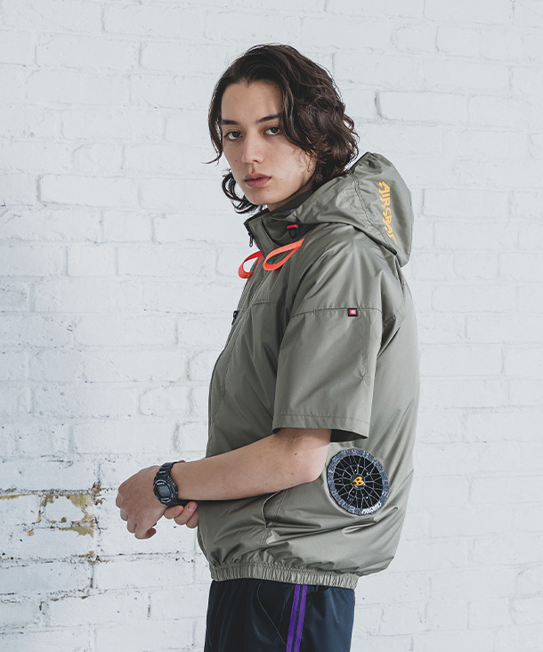 | 素材 | マイクロソフトシェル アルミコーティング加工[UVカット(UPF50+)、遮熱効果(-8℃)]、撥水効果 ポリエステル100% |