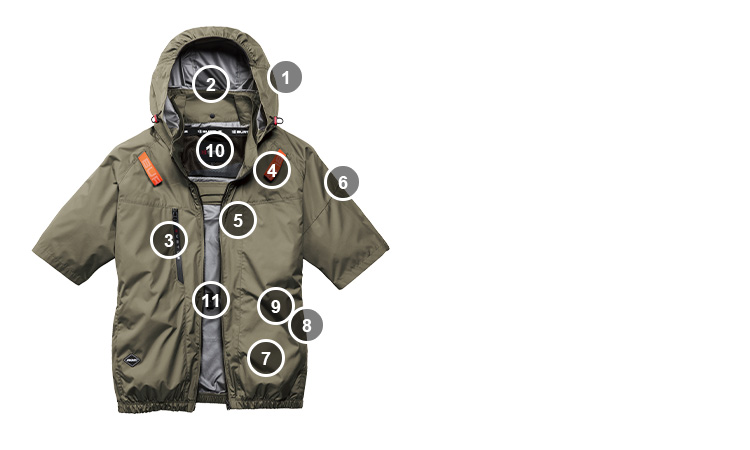 着脱式ヘルメット対応フード、フックハンガー、背ランヤードホールを配備し、フルハーネスにも完全対応。安全装備と併用する現場でも安心してご使用いただけます。