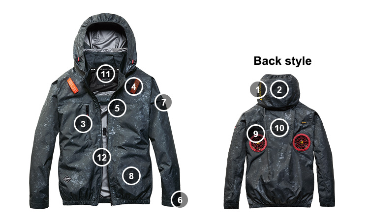 着脱式ヘルメット対応フード、フックハンガー、背ランヤードホールを配備し、フルハーネスにも完全対応。安全装備と併用する現場でも安心してご使用いただけます。