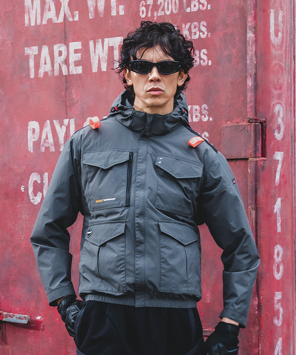 ナイロン100%の軽量シェル素材にアルミコーティング加工(遮熱効果-15℃)を施し、炎天下でも衣服内温度の上昇を抑制。