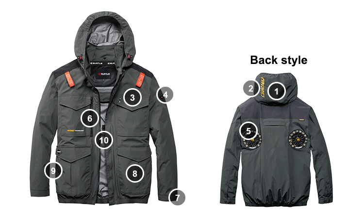 着脱式ヘルメット対応フード、フックハンガー、背ランヤードホールを配備し、フルハーネスにも完全対応。安全装備と併用する現場でも安心してご使用いただけます。