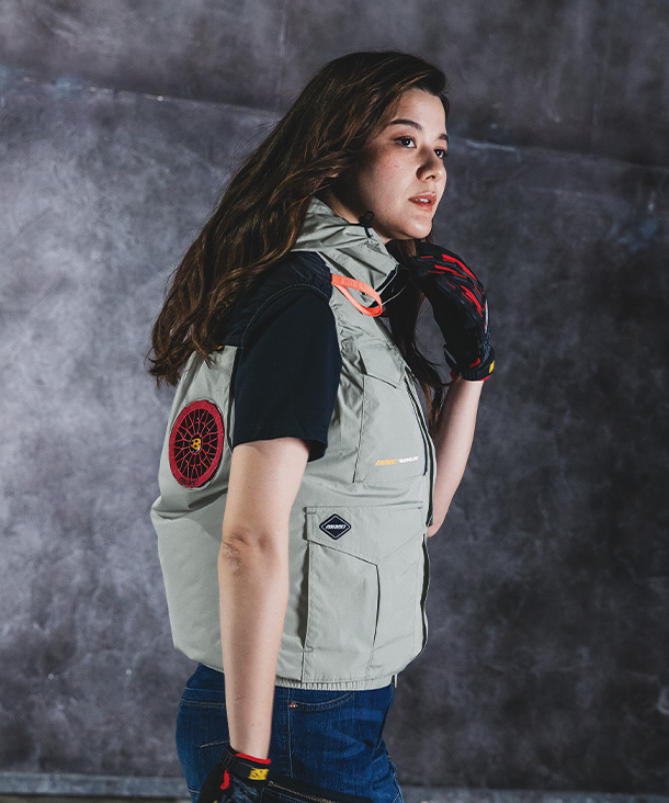 肩甲骨付近の背中高い位置にファンを配置。フルハーネスや腰巻道具、草刈り機と干渉せず、装着感を損なわずに涼しさを実現します。
