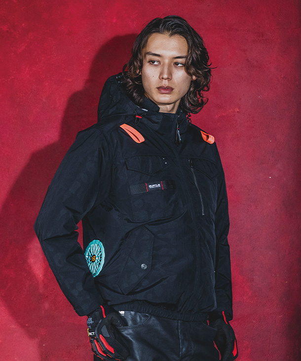 ヘルメット収納対応フード(着脱式)、フックハンガー、背ランヤードホールを装備し、フルハーネス装着にも対応。