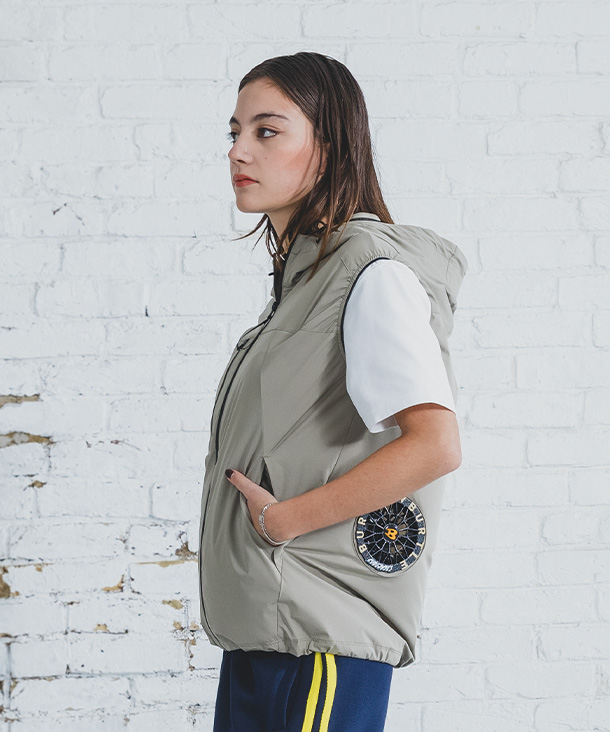 半袖やジャケットの上からも重ねやすいベスト形状で、通勤や散歩、アウトドアなど幅広いシーンで活躍します。